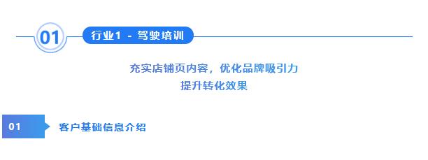 ● 落地页选择:店铺首页/门店单页均可,驾驶培训用户很注重头图和品牌介绍版块,需要在此版块充分展现教学优势,如学车优惠、品牌背书、学车快、 1v1不用等、班型丰富等等