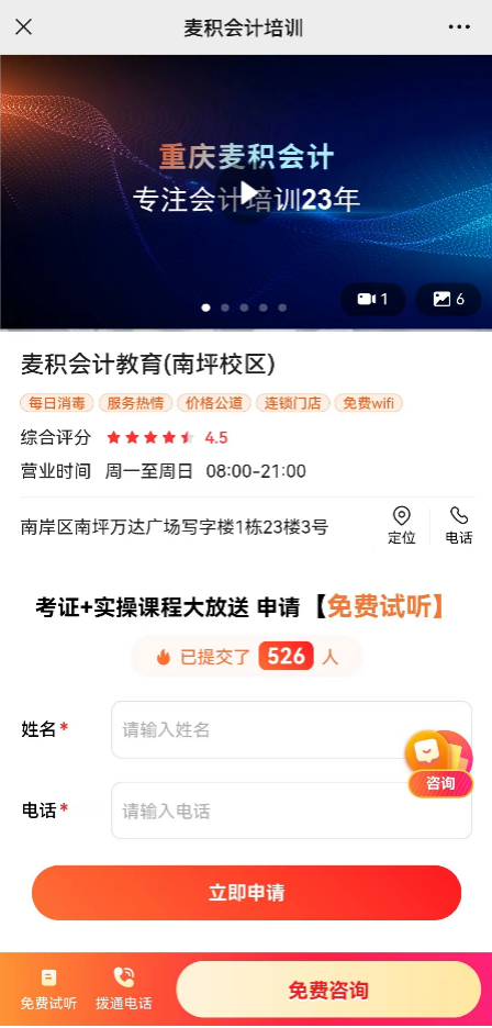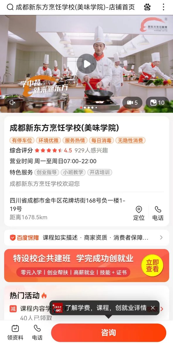 ● 落地页选择:店铺首页/门店单页均可,餐饮培训用户很注重课程版块,需要优质的配图和介绍,说明清楚餐饮课程的内容与课程配置等