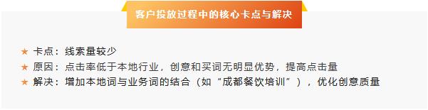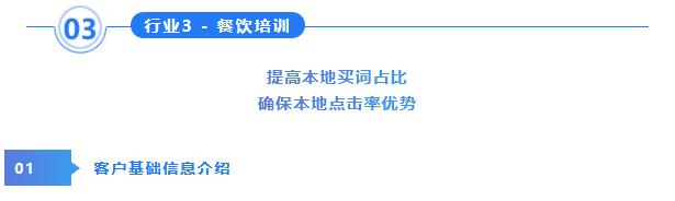A. 广告:本地餐饮培训点击率均值为3%,如点击率未高于均值,需要着重优化创意、买词等广告投放基础设置;拉取搜索词报告,确定用户搜索本地化习惯,优化对应关键词和创意