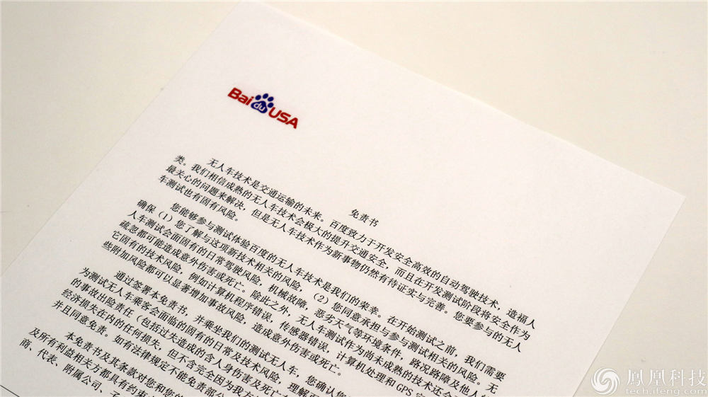凤凰网科技分别先后体验了SAE L3/L4两种级别的无人车,根据相关等级定义L3(有条件自动驾驶)面向低速缓行、自动泊车等场景,L4(高度自动驾驶)则更接近自动驾驶技术的理想上路状态。在试乘之前,个人需要签署一份《免责书》,同时根据加州法律无人车的主驾驶位也必须有人。
