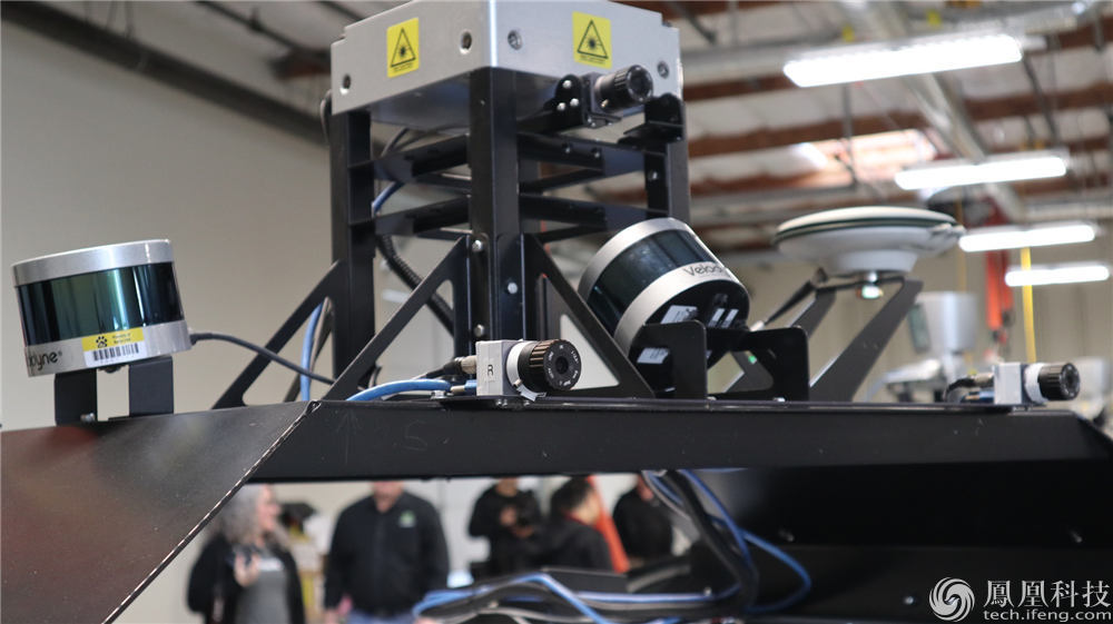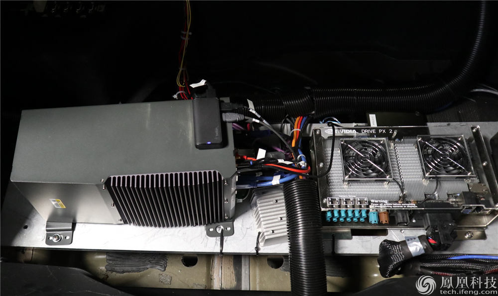 事实上在等待试乘之前,凤凰网科技在百度美研的车库内近距离观察了L4无人车细节。试乘的这款L4顶部配有64线激光雷达*1,两侧还有16线激光雷达*2以及两枚摄像头,车前也配有毫米波探测雷达。后备箱中运行两台计算机,一台为中空电脑一台为NVDIA视觉识别电脑。