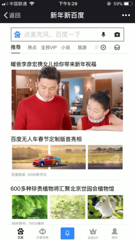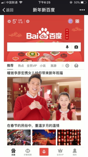 今年春节期间,一条百度公司董事长兼首席执行官李彦宏携爱女拜年的视频在网络流传。视频中,二人身着红衣,以拜年的形式向大家介绍了百度APP,而拜年的“地点”就是百度App的首页。视频以“新年新百度”为名,那么这个新百度究竟新在哪?