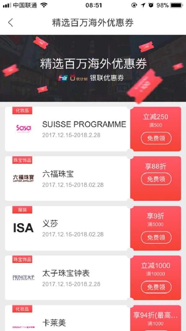 除了住得好一点,高性价比购物是境外游的另一大诉求。此次活动集锦了香港、澳门、台北、曼谷等各大城市的热门百货、店铺银联购物优惠券,用户可直接在活动页面领取。到达目的地后,只需出示百度地图App中的卡券并用银联卡支付,即可乐享购物优惠。