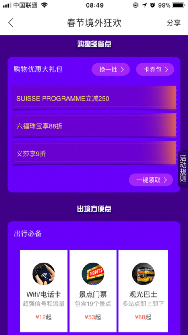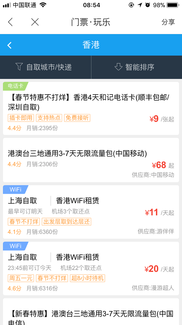 此外,活动还提供出行WiFi/电话卡、热门景点门票和观光巴士车票预订。与酒店相同,用户可在根据服务价格、可用日期、服务语言等多维度对比后直接下单购买,体验一站式贴心出行服务。