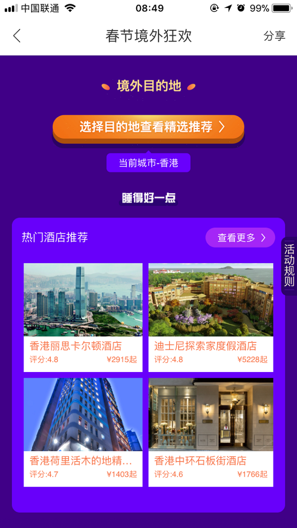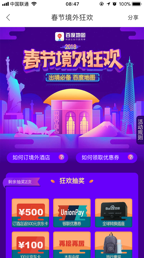 2月9日,为全面提升用户境外出行购物体验,百度地图上线了春节境外狂欢活动。国内用户可通过活动页面选择出境旅游目的地,一键查看当地优质酒店与必备商品等推荐信息。通过百度地图直接下单预定酒店的用户,还可享受海外购物优惠券、每日登陆抽奖等多重出境游好礼。