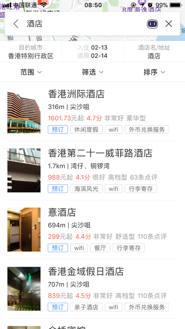 酒店推荐页面包含酒店的位置、评分、价格、照片和能够提供的定制服务信息(如外币兑换、行李寄存、亲子酒店等),用户可进行多维度比较,选择喜欢的酒店,直接在百度地图App进行预订。
