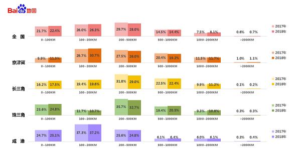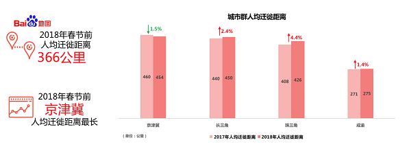 迁徙距离方面,春节前全国人均返乡迁徙距离为366公里,其中京津冀人均迁徙距离长,人均迁徙454公里,成渝短,人均迁徙275公里。相比2017年,今年珠三角地区人均迁徙距离涨幅高,人均多迁徙18公里。