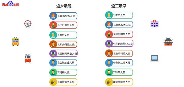 不过,当全国人民都沉浸在春节假期时,部分人仍心系工作。报告显示,春节期间,景区服务、出行服务、医护三个领域的从业人员辛苦。从返乡和返工时间来看,这三个行业的从业人员返乡晚,返工时间早。