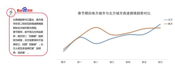 传统习俗方面,回娘家、走亲戚是每年春节不可或缺的环节。根据报告,南方城市在初二、初五的拥堵趋势更明显,这或与南方人“初二回娘家”的风俗有关系,而北方人因为“初五迎财神”的习俗,更倾向于初三、初四探访亲戚。