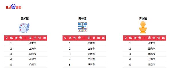 节中,文化热潮席卷一线及各大省会城市,逛美术馆、图书馆、博物馆成为过年新方式。报告显示,北京、上海、深圳等一线城市的美术馆及图书馆热度较高,西安、成都、南京等省会城市的博物馆热度较高。